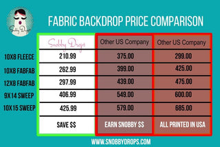 The majority of US based backdrop companies use the same fabrics printed by the same printing company, which is why you can expect the highest quality. It also means that it costs US backdrop company A the same amount to have their design printed on fleece or wrinkle-free fabric as it would for US backdrop company B.