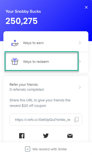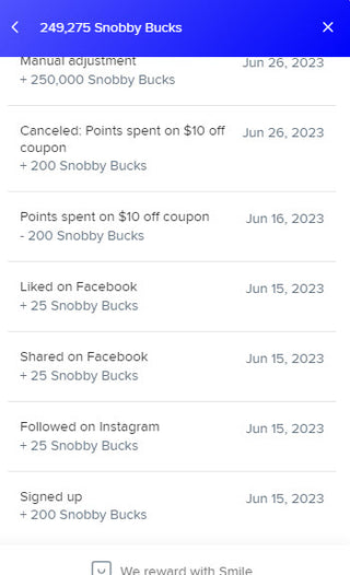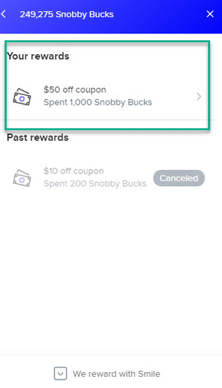 - SIGN UP [PURPLE REWARDS ICON AT THE BOTTOM RIGHT OF SCREEN]: You get 200 Snobby Bucks JUST for signing up